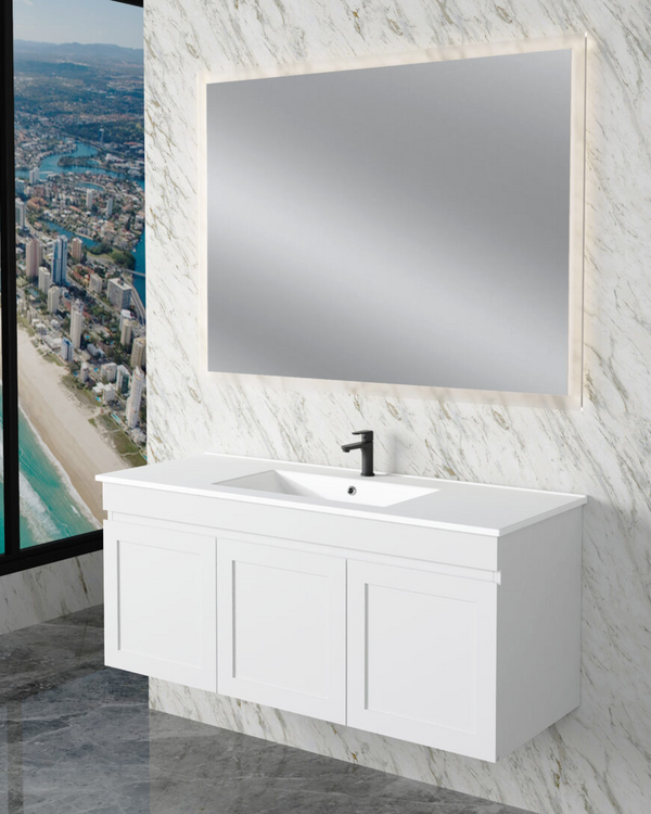 Vanity Colour Matte white Materials Plywood VANITY SIZES 600mm BY NUMBER OF BASINS Single Bowl VANITY CATEGORIES Single Bowls, Wall Hung Vanity Riva Luxury Vanity Miami Gross Weight 18.9kg Packaging Dimensions 630*490*545mm TOP Cabinet Only, With Eden Ceramic Top, With Handy Ceramic Top, With Volvo Poly Marble Top