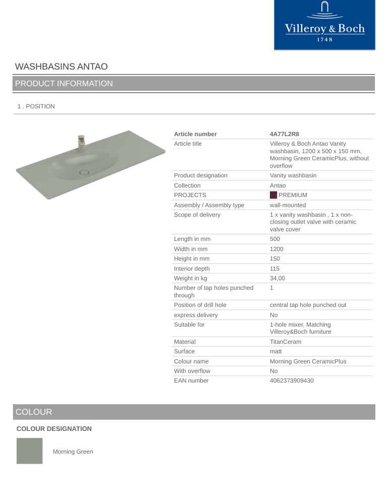 Villeroy & Boch Antao Vanity washbasin, 1200 x 500 x 150 mm, Morning Green Ceramic Plus, without overflow