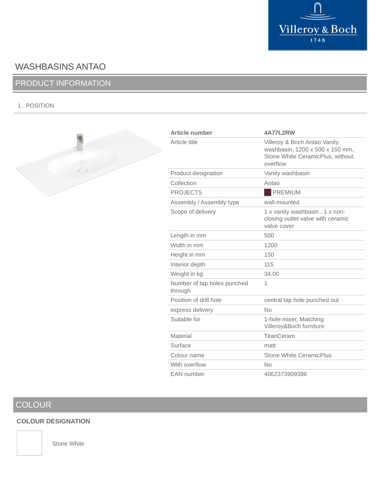 Villeroy & Boch Antao Vanity washbasin, 1200 x 500 x 150 mm, Stone White Ceramic Plus, without overflow