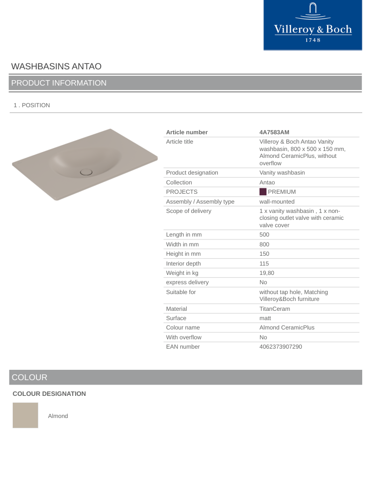 Article title: Villeroy & Boch Antao Vanity washbasin, 800 x 500 x 150 mm, Almond Ceramic Plus, without overflow