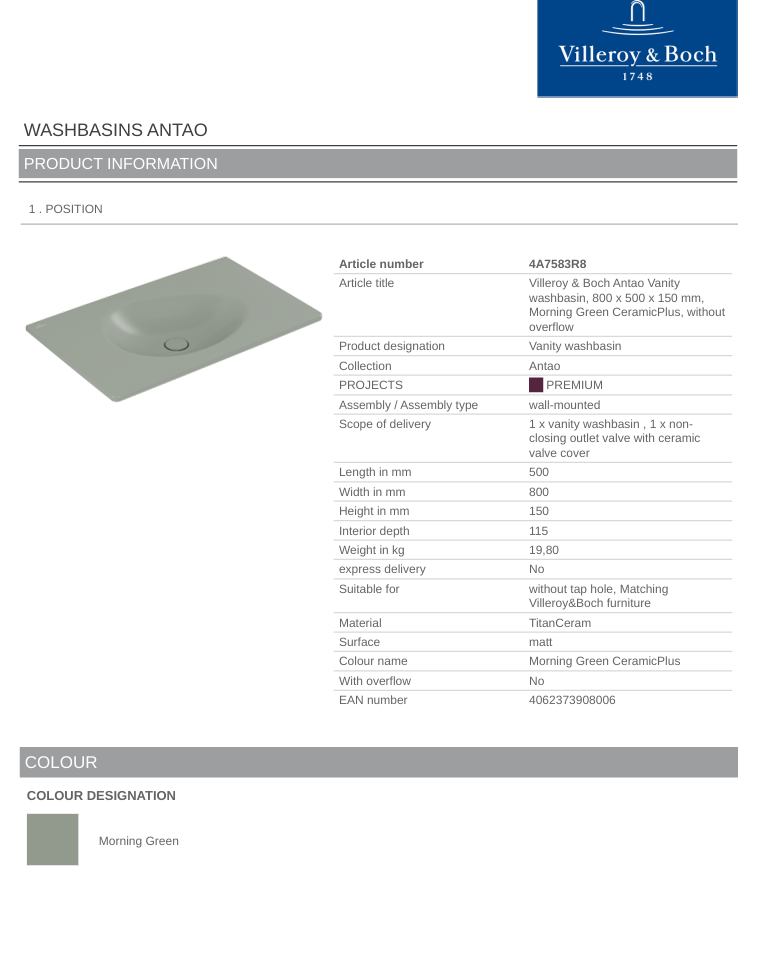 Article title: Villeroy & Boch Antao Vanity washbasin, 800 x 500 x 150 mm, Morning Green Ceramic Plus, without overflow