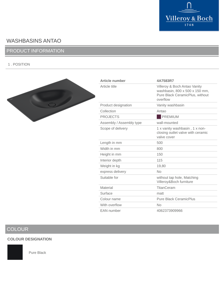 Article title: Villeroy & Boch Antao Vanity washbasin, 800 x 500 x 150 mm, Pure Black Ceramic Plus, without overflow