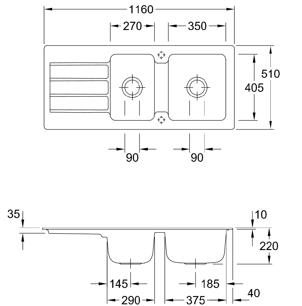 Architectura 1160 Drainer Sink No Tap Hole Stone White CeramicPlus