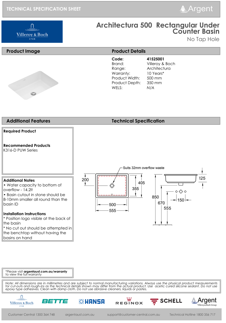 Architectura 500 Rectangular Under Counter Basin No Tap Hole