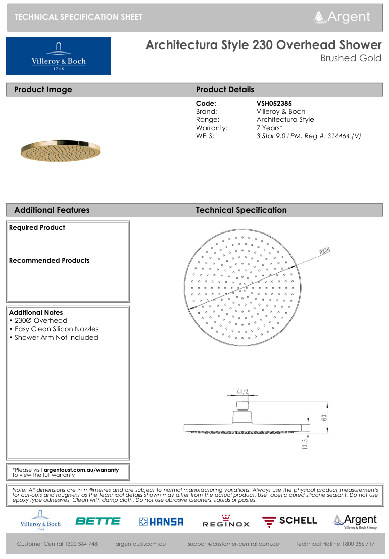 Architectura Style 230 Overhead Shower Brushed Gold