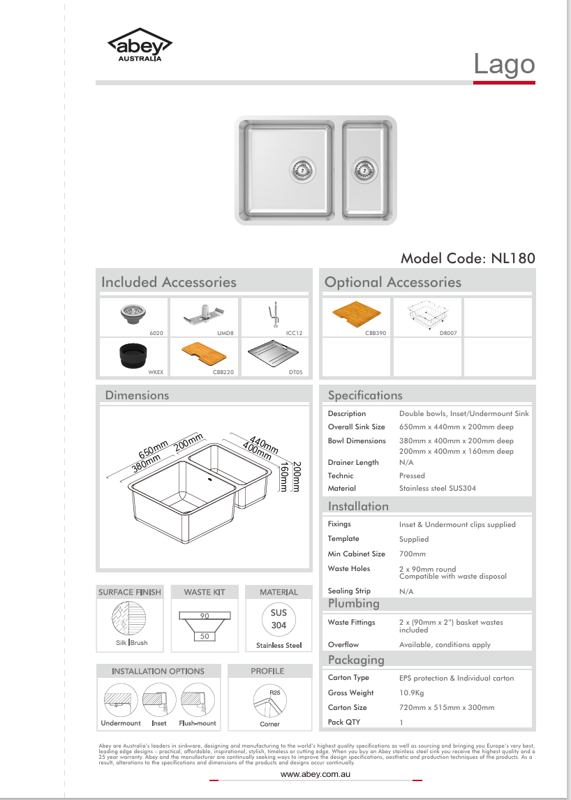 | Mounting | Top Mount, Undermount |
