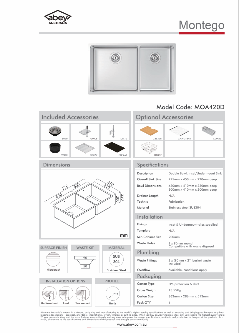 | Mounting | Top Mount, Undermount |