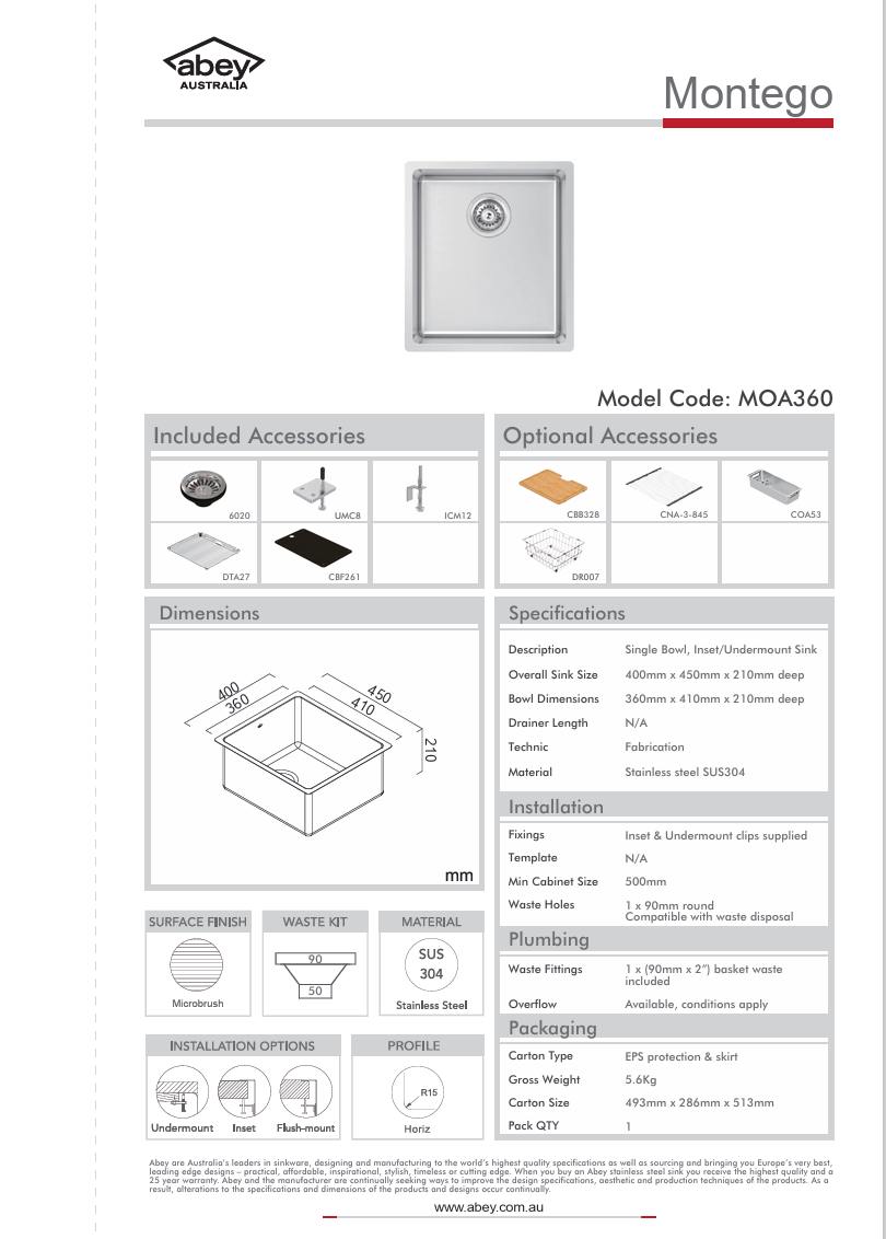 MONTEGO SINGLE BOWL 400 X 450 + ACC