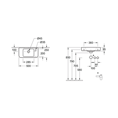 O.novo 2.0 500 Hand Wash basin 1 Tap Hole Right Hand
