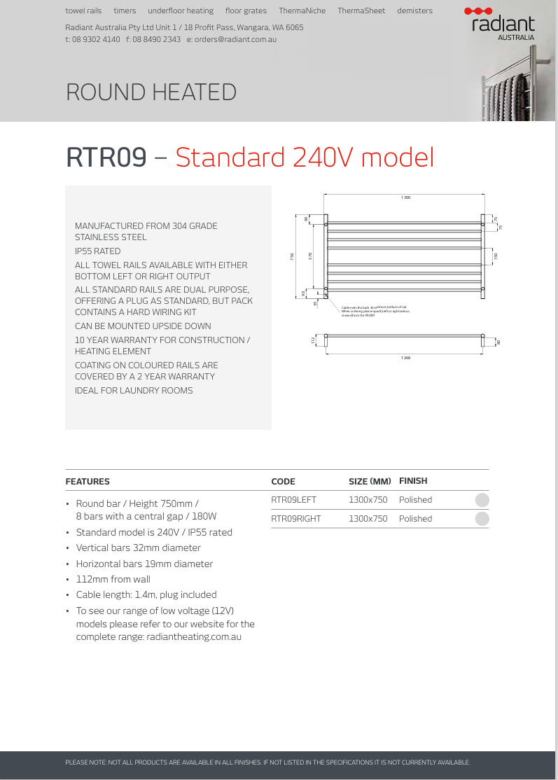 Polished 1300 x 750mm Rnd Heated Towel Rail LEFT